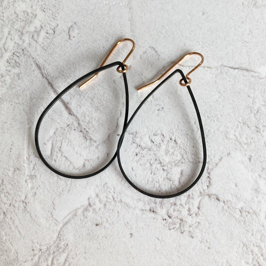 Black Brass Teardrop Hoops on Rose Gold Plated Ear Wires