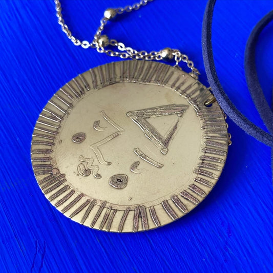 SISTER SUN 9 Brass pendant on blue cord